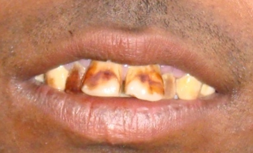 Figure 3. A young villager afflicted with severe dental fluorosis due to drinking of fluoridated groundwater in the state of Rajasthan, India characterised with bilateral strati?ed deep brownish staining of anterior teeth (Source: Reference number 26).