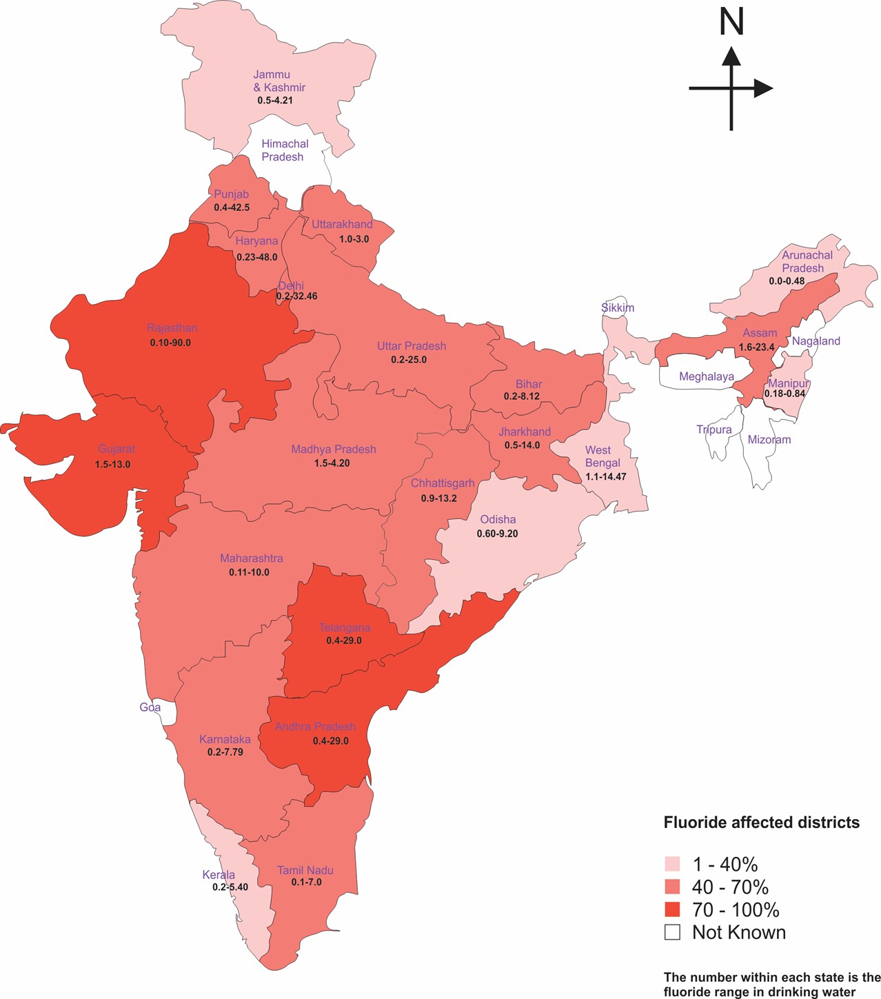 Figure 2. Map of India showing fluoride (in ppm) contamination of drinking groundwater in different states and union territories (Source: Reference number 5).