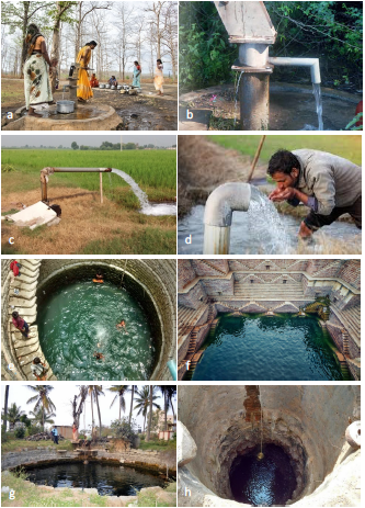 Figure 1. The most common drinking groundwater sources in the rural areas of India. Hand-pumps (a and b), bore-wells (c and d), step-wells (e and f), and open deep dug-wells (g and h).