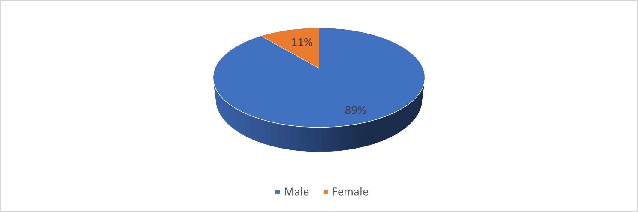 A total number of 45 students from the Department of Physical Education and Sports Sciences at Chittagong University participated in this research. All the participants were below 24 years of age. The mean ± SD age of our participant was 22.07 ± 0.92 with a range of 20-24 years. The majority of the students were 22 years old (44.4%) followed by 23 years old (31.1%). Among them, a vast majority of our participants were male (n=40, 88.9%). Number of females were very few (n=5, 11.1%) (Figure 1).