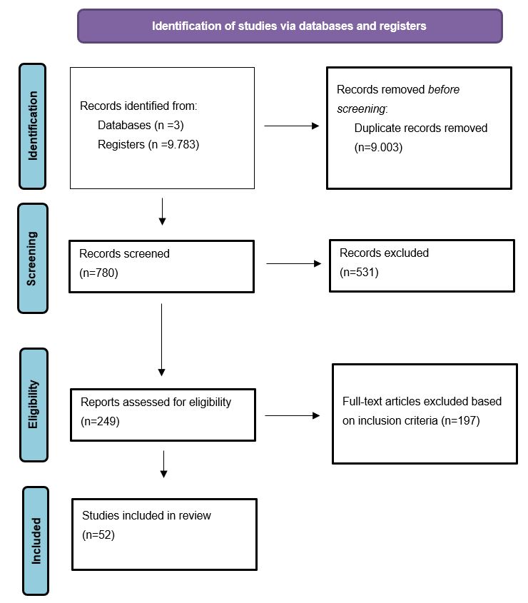 The study was conducted from November to December 2020. The first search registered 9,783 articles. After removing duplicate articles and applying the inclusion and exclusion criteria, a total of 52 articles were included (Figure 1).