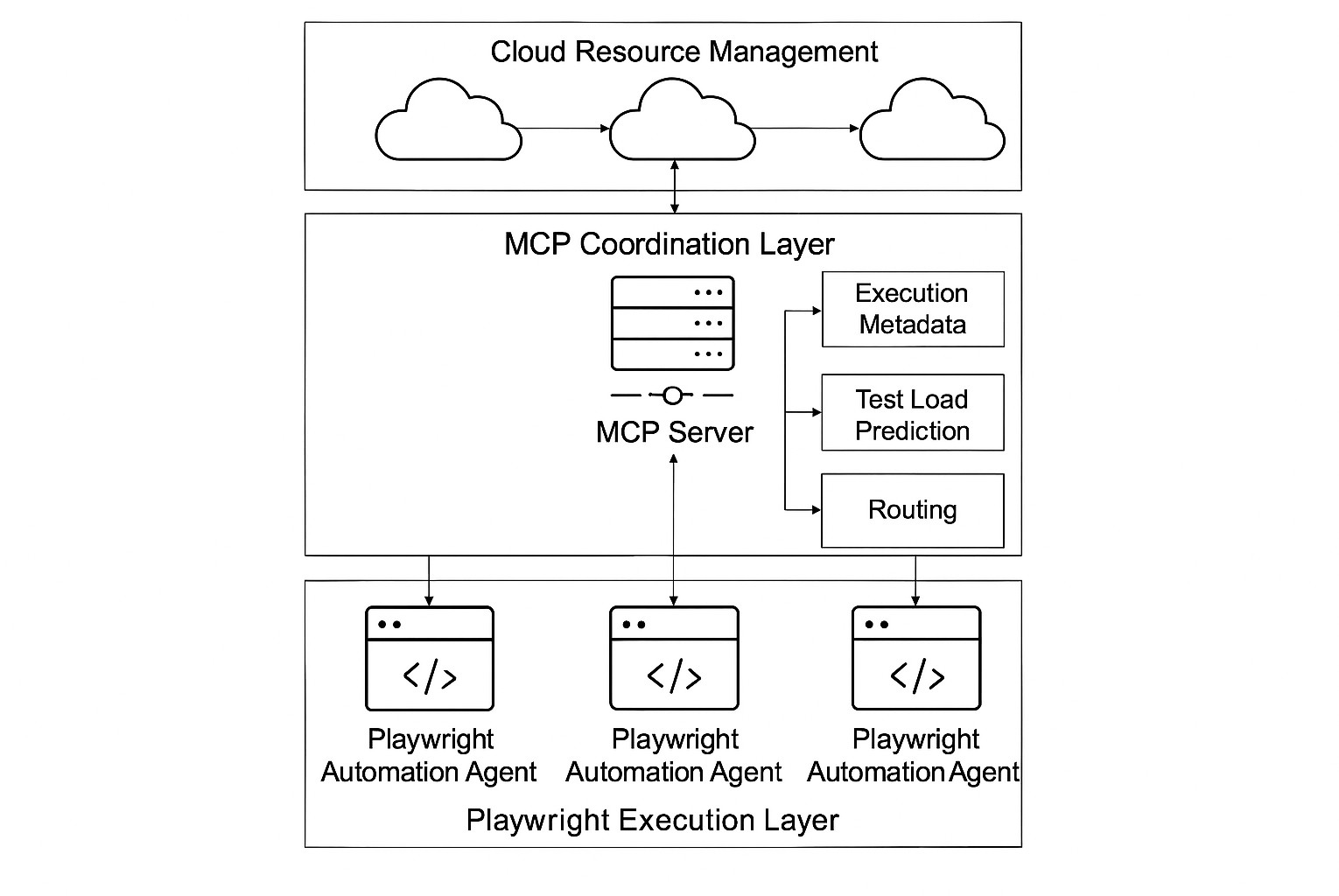 As illustrated in Figure 1, the architecture comprises three layers: the Playwright execution layer, the MCP coordination layer, and the Cloud Resource Management layer. MCP servers collect execution metadata, predict test load using machine learning models, and route tests to optimal cloud instances.