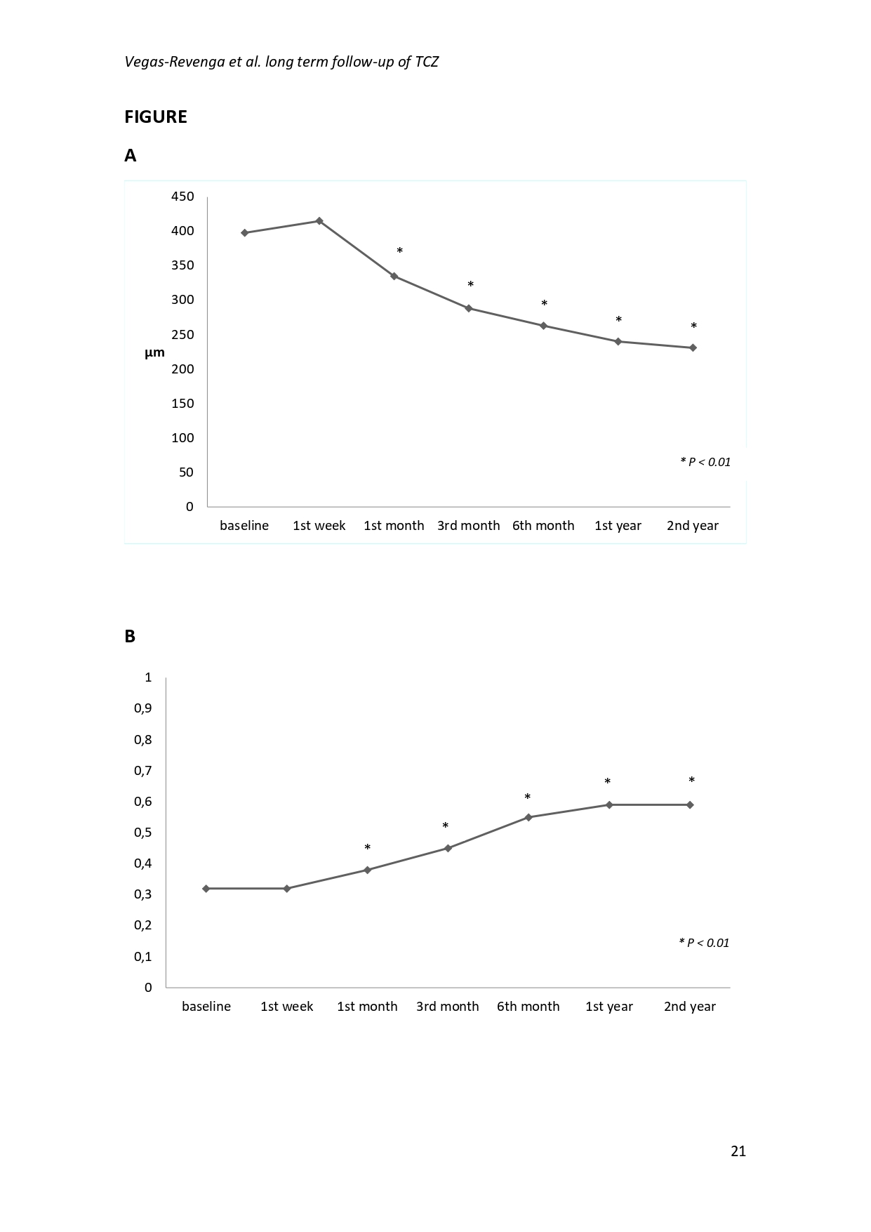 Results: 7 patients with a mean age of 38.9 ± 17.8 years with refractory uveitic CME were studied. Underlying diseases associated were: juvenile idiopathic arthritis (n=3), Birdshot (n=2) and idiopathic uveitis (n=2). All patients had bilateral involvement. TCZ was prescribed in combination with conventional immunosuppressive drugs in 5 of 7 patients. After 24 months of therapy, a statistically significant improvement in macular thickness (397.8 ± 232.1 µm vs. 231.3 ± 42.1 µm, P<0.01) and BCVA (0.32 ± 0.23 at baseline vs. 0.59 ± 0.33 at 24-month last visit, P=0.007) was obtained. A glucocorticoid sparing-effect was also observed. Remission was achieved in 6 patients and no severe adverse events were noticed at 2 years follow-up.
