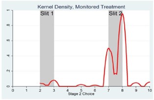 Figure 3: Quantum nature of will (cited from J. Duffy and T. Loch-Temzelides, 2021). a) Estimated kernel density, monitored treatment. b) Estimated kernel density, unmonitored treatment.