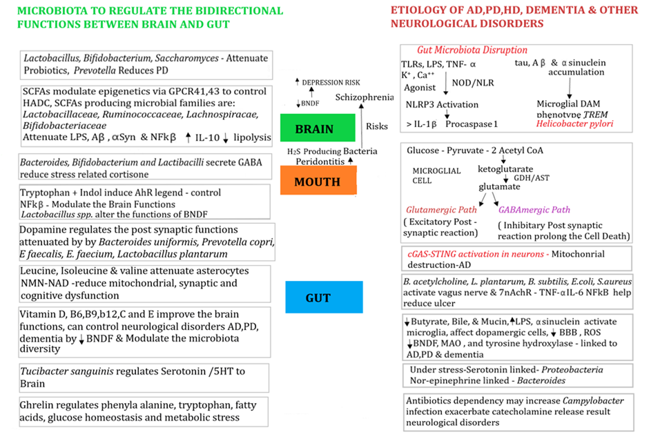 Neuropsychiatric disorders have been the constant burden impacting healthcare since 1990, and more than 3 billion people worldwide are living with neurological conditions. Mental health conditions with cognitive decline were also observed in people who contracted SARSCoV-2 and later presented the PACS related disease after the resolution of primary infection. Long term dysbiosis, inflammatory bowel disease (IBD), and neurological inflammations signify the establishment of major depressive disorders (MDD), Alzheimer’s disease (AD), Schizophrenia, Parkinson’s disease (PD), lateral sclerosis etc. More than 4% of cases of periodontitis are likely to develop brain related abnormalities. Conversely, cellular and molecular alterations keep restoring Amyloid beta peptides (Aβ), tau protein, and 2-synuclein protein with plaque formation allow the disease associate microglia (DAM TREM) phenotype to transfer the aberrant signals through post synaptic neurons. Brain related inflammations are accompanied by various agonist molecules, Lipopolysaccharides (LPS), increased C-reactive protein, tumor necrosis factor alpha (TNF-α), and mitochondrial dysfunctions. Firmicutes with Lactobacillus spp., Ruminococcus spp., Lachnospira spp. are the known short-chain fatty acids (SCFAs) producers, those meant to involve in regulating the immunological and physiological functions from Gut-Brain-Gut building homeostasis. Aβ stimulation of glial cells produces anti-inflammatory effects, while controlling the ERK/MAPK/JAK/NFkβ pathways-based inflammations. Serotonin, dopamine, gamma aminobutyric acid (GABA), kynurenic acid are the regulatory neurotransmitters that contribute to the prognosis of neurodegenerative diseases and also reduce the stress related corticosterone. Impaired molecular signals disrupt the endothelial layer of gut and blood brain barrier (BBB) impacting the serotonin production in brain. It is imperative to utilize pre, pro, and postbiotics to modulate the depleted microbiota, could reverse the aberrant signals instigating a better disease prognosis.