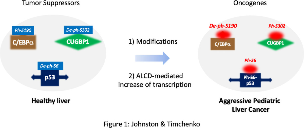 The normal quiescent liver is equipped with a set of molecules which support essential liver functions which also aid in protecting the liver from the development of cancer. One group of these molecules are TSPs. Particularly, normal liver expresses high levels of strong inhibitors of proliferation along with TSPs: Rb, p53, C/EBPα, HNF4α and CUGBP1. In a significant amount of our cases of liver cancer, these proteins are downregulated by silencing of promoters and degradation by the ubiquitin proteasome system [1]. In the course of blinded studies of these specimens, we surprisingly found a group of HBL patients who had an elevation of C/EBPα, CUGBP1, HNF4α and p53. Following review of their clinical records, we discovered that this group represents patients with features of chemo-resistance, relapsed HBL, multiple nodules at diagnosis, vascular invasion, or metastases. In our paper [1] and in two other manuscripts, we have examined modifications of these elevated TSPs and their biological activity (Figure 1). Briefly, C/EBPα: tumor suppressor C/EBPα is dephosphorylated at Ser190 in aggressive HBL and in some cases of HCC [1,6]. We generated C/EBPα-S193A knock-in mice (mouse Ser193 is equivalent of human Ser190) in which the C/EBPα is inactivated and found that S193A mice developed spontaneous liver cancer through de-differentiation of hepatocytes into cancer-like stem cells [7]. Several reports showed that C/EBPα possesses oncogenic activities under specific settings [6,8].CUGBP1: De-ph-S302-CUGBP1 is a tumor suppressor but is eliminated by Gankyrin in classic HBL [9]. In aggressive HBL, CUGBP1 is phosphorylated at Ser302 and works as oncogene [1,10].P53: Well-known TSP p53 was found to be phosphorylated at Ser6 and elevated in aggressive HBL [1]. Our new observations show that ph-S6-p53 possesses oncogenic activities (Johnston, Hepatology, under review). Thus, these recent studies revealed that one of the molecular characteristics of aggressive liver cancer is the conversion of tumor suppressor proteins into oncoproteins.
