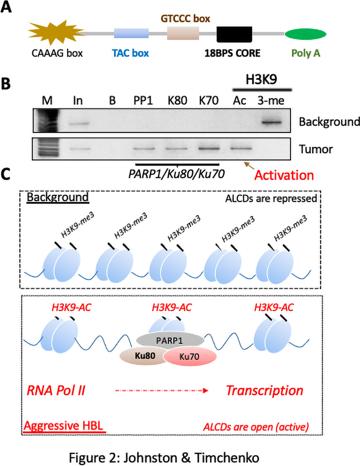 Our studies of the mechanisms by which aggressive HBL increases oncogenic forms of tumor suppressors found specific chromosomal DNA regions (ALCDs) that are observed only in the human genome. These regions are approximately 250 bp long and are located in introns of genes of many oncoproteins and proteins that accelerate development of liver cancer. ALCDs have 85-95% homology between them and contain short 100% homological regions (boxes) which are shown in Figure 2A. Careful molecular analyses showed that the 18S BP core is occupied by PARP1-Ku80/70 complexes. A typical ChIP assay with ALCD is shown in Figure 2B. The binding of the PARP1 complexes correlates with acetylation of histone H3 at K9, which usually demonstrates open chromatin being transcribed by RNA Pol II (Figure 2C).