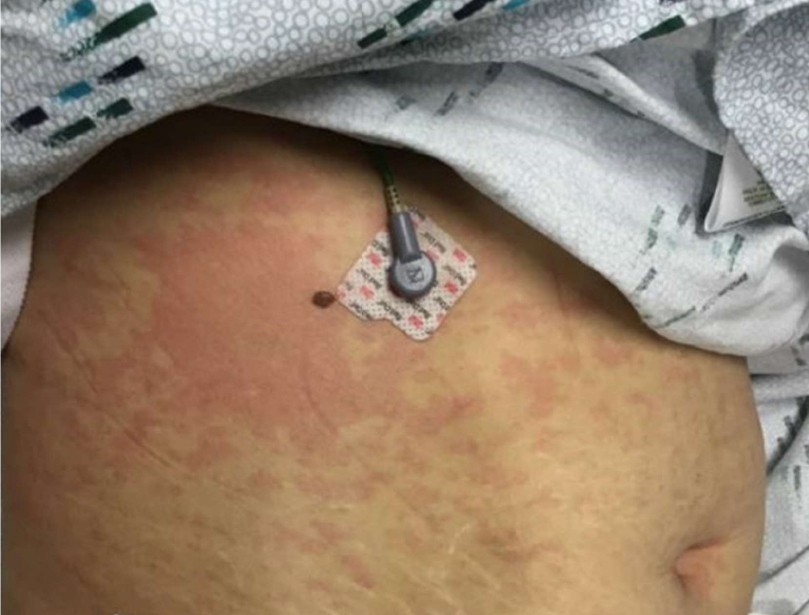She returned to the ED 15 hours later with recurrent fever, leg pain, nausea, vomiting, diarrhea and body aches, lightheadedness, and a headache. The rash was now generalized, pruritic, and tender to palpation. Her vitals now showed a temperature of 103.9°F (39.9°C), pulse of 123/minute and the blood pressure of 96/57 mmHg. She had developed right upper quadrant pain which radiated to the chest. The CRP was now 19.2 mg/dl (0.0- 0.8) and lactic acid was 1.6 mmol/L. Her skin was covered with a blanchable erythematous rash with no induration, vesicles, or bullae (see Figure 1). Examination of her tongue, conjunctiva and vulva did not reveal any mucus membrane involvement. There was no evidence of peripheral lymph node enlargement or splenic enlargement. Her mental status was normal. Sepsis work up was started. Her blood pressure did not respond to 500 ml of Ringers lactate and decreased to 70/49 mmHg. A repeat SARS-CoV-2 test was positive with a Cycle Threshold (CT) value of 42.1 (Cepheid GeneXpert System). She was given 3L of Ringers Lactate and admitted to the intensive care unit (ICU). She was started on norepinephrine and blood cultures were obtained. 200 mg of Intravenous remdesivir was initiated. The patient received only one dose. A lumbar puncture did not show any evidence of meningitis. A day after admission an echocardiogram revealed a left ventricular ejection fraction of 60-65%. Two days later it was down to 35-40% with a normal left ventricular size and wall thickness with sinus bradycardia of 40 beats/minute. Immunoglobulin levels and a connective tissue disease panel were normal. Differential diagnosis included urticaria and urticarial vasculitis with systemic features. Based on her positive SARS-CoV-2 test and the absence of a history of urticaria, a diagnosis of MIS-A was made on her second day of admission and she was started on a hydrocortisone sodium succinate (Solucortef) 50 mg every six hours and a single infusion of human immune globulin (Privigen) infusion of intravenous immune globulin at a dose of 2 g/kg (total of 90 g). Within 24 hours the rash, fever and abdominal pain had resolved, and she did not need norepinephrine. The rest of her hospital stay was focused managing bradycardia, fluids and tapering her steroids. A punch biopsy of the skin of the right calf revealed superficial perivascular lymphohistiocytic inflammatory infiltrate with mild focal vacuolar change.