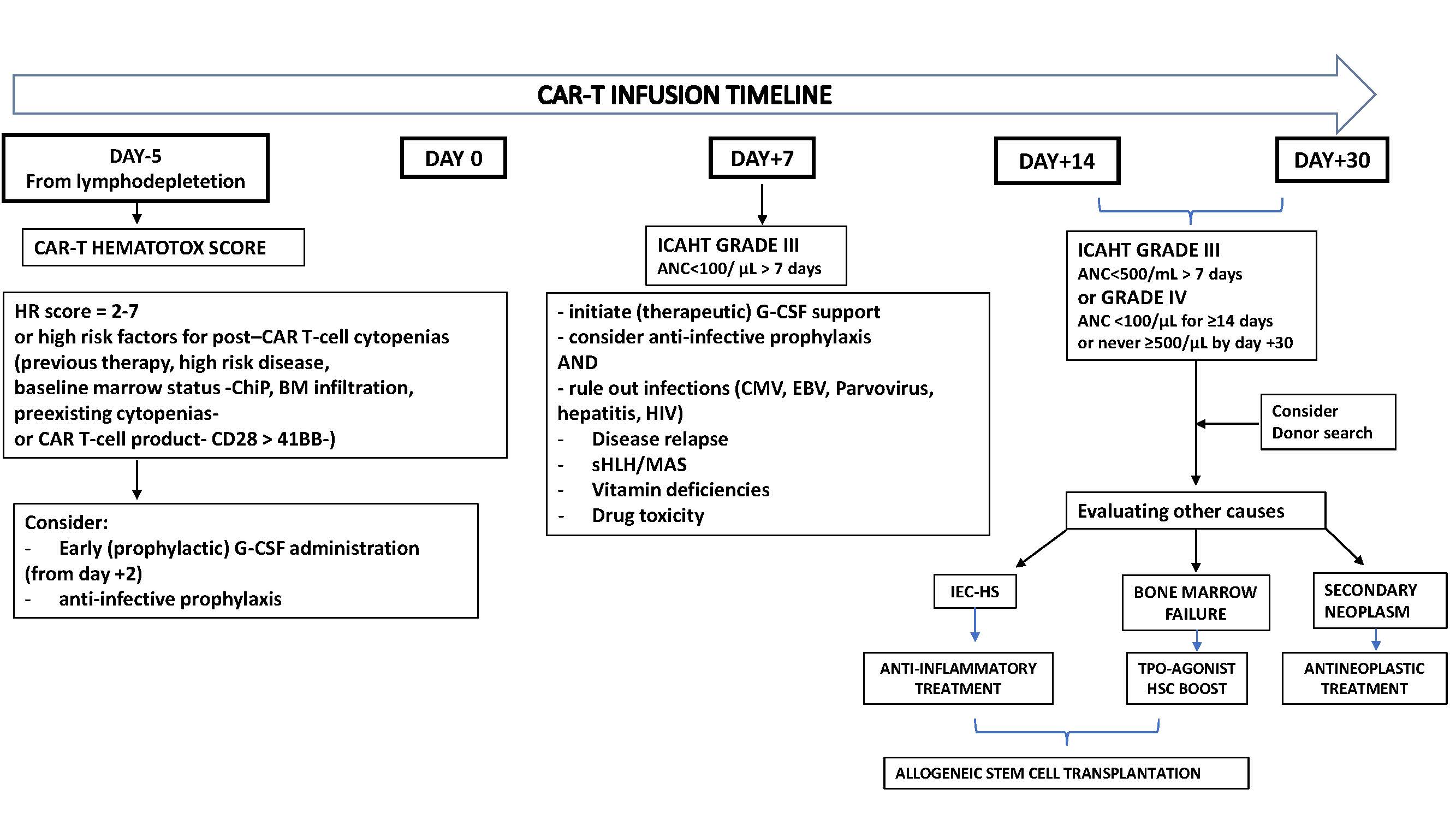 Patients who remain unresponsive or refractory to G-CSF beyond day +14 following CAR-T cell infusion constitute a clinically challenging subgroup, as they are at high risk of developing severe and potentially fatal infections. In cases of severe ICAHT where an inflammatory trigger is suspected (such as concomitant CRS/ICANS or CRS/MAS), anti-inflammatory approaches including pulse-dose corticosteroids and/or cytokine-directed therapies (eg, tocilizumab or anakinra) may be warranted. An additional therapeutic option involves the use of cryopreserved autologous or allogeneic CD34+ hematopoietic stem cells collected prior to therapy (either before auto- or allo-HCT) [19]. Early administration of a readily available hematopoietic cell boost (HCB) has been associated with improved survival outcomes. Accordingly, the expert panel recommends considering HCB infusion without preceding conditioning chemotherapy in patients with grade ≥3 ICAHT persisting beyond day +14, provided that (1) a suitable boost is available and (2) refractoriness to G-CSF has been confirmed [20]. If the aforementioned strategies prove ineffective or unavailable and grade 4 ICAHT persists beyond day +30, the expert panel advises initiating a donor search for a potential allo-SCT as an ultima ratio. The decision to proceed with allo-HCT should be individualized and discussed on a case-by-case basis [21]. A time window between months 3 and 6 after CAR-T cell infusion was considered reasonable, balancing the elevated risk of infectious complications against the possibility of spontaneous hematologic recovery [9]. Once the decision to pursue allo-SCT has been made, critical aspects such as donor selection, conditioning regimens, and immunosuppressive strategies must be carefully evaluated. Given the paucity of experience and the scarcity of supporting evidence in this setting, only general considerations can currently be provided.