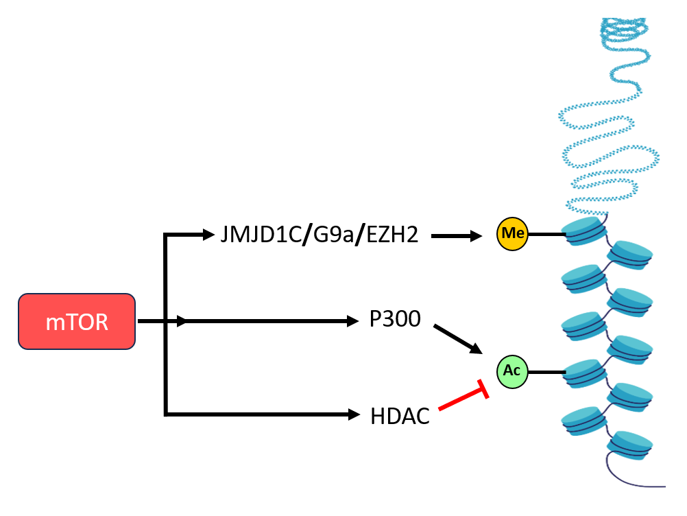Histone modifications are essential for dynamically regulating gene expression by altering 247 chromatin structure and accessibility [62]. These modifications, primarily methylation and acetylation, are mediated by specific enzyme families, including histone methyltransferases (HMTs), histone demethylases (KDMs), histone acetyltransferases (HATs), and histone deacetylases (HDACs) [63]. Emerging studies have identified mTOR as a key modulator of chromatin dynamics, influencing both epigenetic modifications and transcriptional regulation. One crucial target, Enhancer of Zester 2 (EZH2), functions as the catalytic subunit of the Polycomb repressive complex 2 (PRC2) and is responsible for adding di- and tri-methyl groups to histone H3 at lysine 27 (H3K27me2 and H3K27me3), which are marks of transcriptional repression [64]. EZH2 is frequently overexpressed in multiple cancers, such as breast, prostate, and bladder cancers, making it a target for the anticancer drug tazemetostat. Notably, mTORC1 has been found to elevate EZH2 protein expression, leading to increased H3K27me3 levels and enhanced cell proliferation [65]. Beyond EZH2, mTORC1 also influences histone methylation through its regulation of the histone methyltransferase G9a, which catalyzes the repressive H3K9me2 modification. This regulation suppresses the transcription of autophagy-related genes, thereby inhibiting autophagy and promoting cellular growth [66]. The Jumonji-C domain-containing (JMJD) protein family consists of important histone demethylases involved in transcriptional regulation [67]. Among them, JMJD1C plays a key role in lipid metabolism by demethylating H3K9me2 at the promoters of genes involved in lipogenesis. mTORC1 phosphorylates JMJD1C at T505, facilitating its recruitment to these promoters and thereby promoting lipid biosynthesis [68]. These findings highlight a direct link between mTORC1 and the epigenetic regulation of metabolic processes. Histone acetylation is another crucial epigenetic modification that impacts chromatin accessibility and transcriptional activation [69]. This process is controlled by HATs, which add acetyl groups, and HDACs, which remove them [69]. Studies in yeast have demonstrated that TORC1 modulates histone acetylation through the Esa1 HAT complex and the Rpd3 HDAC [70]. In mammalian cells, mTORC1 phosphorylates S4 of the HAT p300, disrupting its autoinhibitory conformation. This phosphorylation alters p300 activity, reducing autophagy under nutrient deprivation while enhancing lipid biosynthesis [71]. These insights underscore the significant role of mTORC1 in regulating histone acetylation to coordinate metabolic processes.