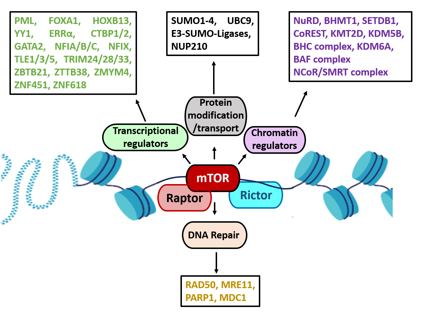Audet-Walsh et al. (2017) reported that many of the genes involved in the metabolic processes, were identified as direct targets of nmTOR and these findings highlighted nmTOR as crucial metabolic reprogrammer [57]. Additionally, Dufour et al. (2022) reported that the mTOR interactome was highly enriched for factors involved in chromatin remodeling, highlighting a pivotal role for mTOR as a direct regulator of the epigenome [59]. Their study showed that mTOR associates with key components of several chromatin remodeling complexes, including the nucleosome remodeling and deacetylase (NuRD) complex, CoREST, the BRAF-HDAC complex (BHC), the BAF complex, and the NCoR/SMRT complex, along with multiple histone modifiers such as the methyltransferases EHMT1, SETDB1, KMT2D, and the demethylases KDM5B and KDM6A. Furthermore, mTOR was found to interact with numerous transcription factors and coregulators, including PML, the pioneer factors FOXA1 and HOXB13, YY1, and the nuclear receptor ERRα (ESRRA), all of which have previously been associated with nmTOR activity. Additional transcriptional interactors identified in the mTOR interactome included C-terminal binding proteins (CTBP1/2), GATA2, nuclear factor 1 proteins (NFIA/B/C, NFIX), transducing-like enhancer proteins (TLE1/3/5), tripartite motif-containing proteins (TRIM24/28/33), and a range of zinc finger proteins such as ZBTB21, ZBTB38, ZMYM4, ZNF451, and ZNF618 [59]. Importantly, the mTOR chromatin interactome was also linked to DNA repair processes, with interactions detected with key repair proteins such as RAD50, MRE11, PARP1, and MDC1, suggesting that mTOR, as a member of the PIKK family, could play a dual role in both transcriptional regulation and DNA repair.