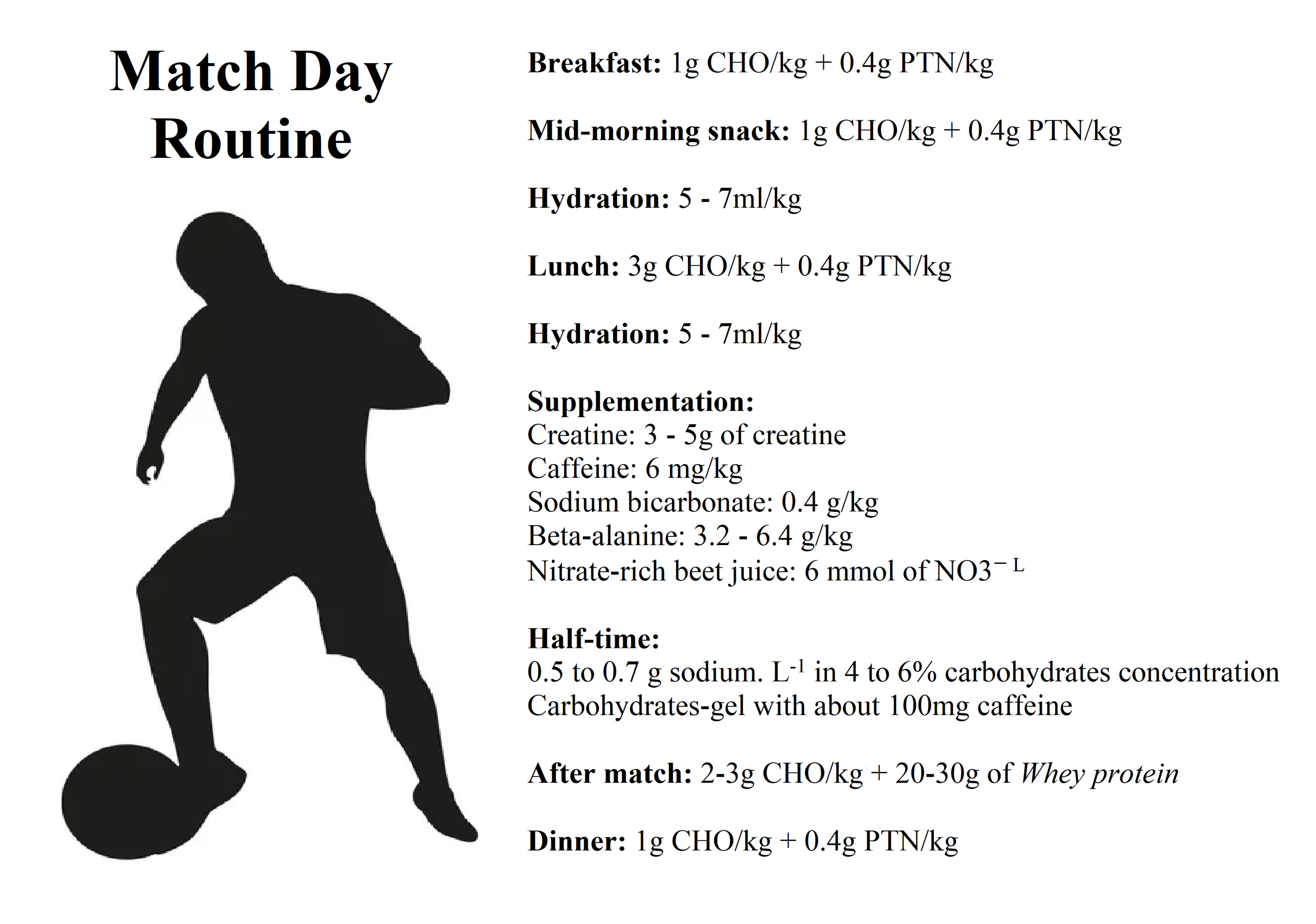 Many questions arise from what may or may not be applicable for an elite soccer player to do during the competitive match day. Currently, we know that athletes are concentrated in hotels and there they receive all the food for the day, i.e., the match day diet. Besides that, the supplementation is usually offered at the stadium. But how would the diet and supplementation recommendations of this day specifically be?