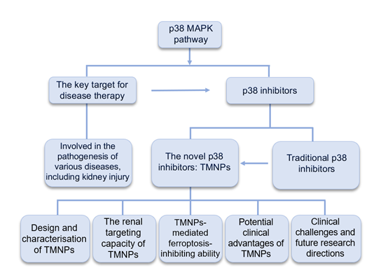 In conclusion, the development of self-assembling P38 peptide inhibitor nanoparticles represent a significant advancement in nephrology, offering a novel therapeutic approach to ameliorate the transition from AKI to CKD. By targeting key anti-ferroptosis pathways involved in AKI and leveraging the advantages of nanotechnology, TMNPs hold great promise for improving patient outcomes. Overcoming the remaining challenges and translating these findings into effective clinical therapies requires ongoing research and intensive collaboration. The potential of TMNPs to transform the landscape of kidney disease treatment is immense, and their successful development and application could significantly enhance the quality of life for patients with AKI and CKD (Figure 1).
