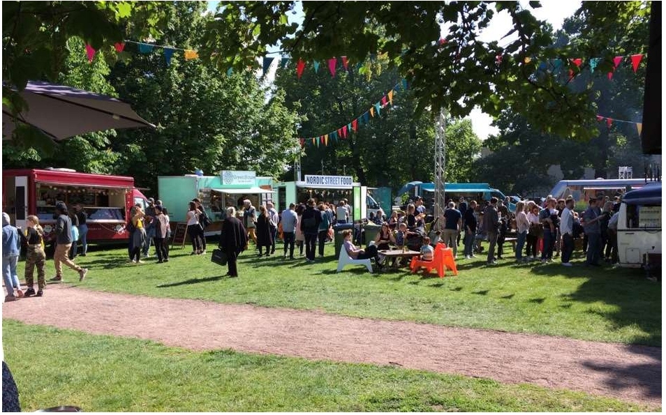 Opposed to serenity in the model is a social quality, associated with places with lots of people, life, and movement. The quality is often strong around social meeting places such as larger playgrounds, cafés, restaurants, or at various cultural events (Figure 4). It might thus in many ways be regarded as an essentially urban quality. It commonly occurs together with a Cultural quality, which describes places with a significant and evident degree of human impact (Figure 5). It can, for example, be strengthened through various building constructions, flower beds, fountains, art installations, sculptures, etc. As such, it stands in clear contrast to the opposing Natural quality. Both a Social and a Cultural quality seem easy to support even in relatively small green areas.