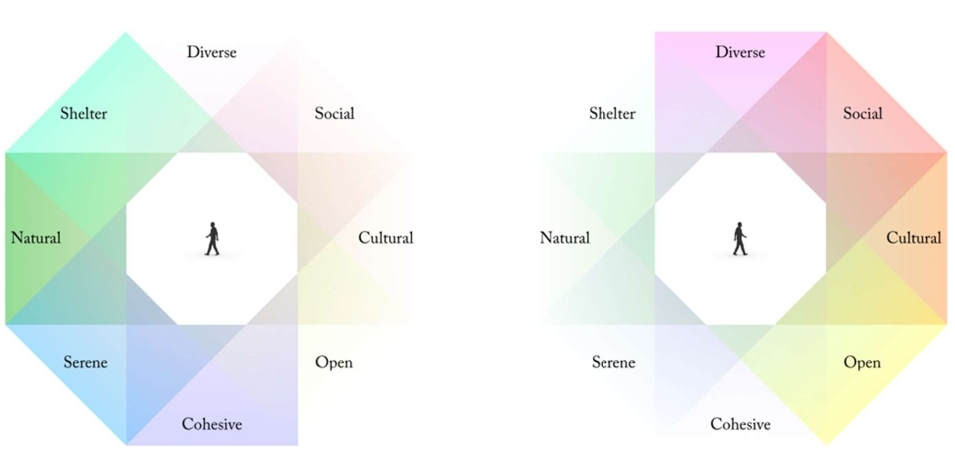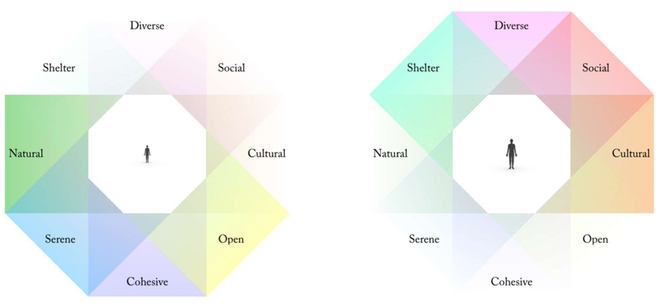 Figure 11: Research shows that people in need of stress recovery to a greater extent seek out environments perceived as Natural, Sheltered, Serene, and Cohesive (left). As the need for recovery decreases, Cultural, Open, Diverse and Social environments often become more important (right).