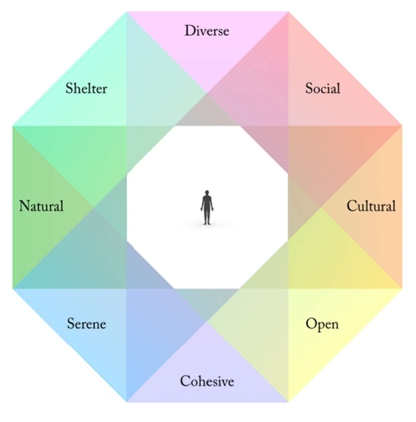 Figure 1: Eight perceived sensory dimensions supporting complementary needs. All qualities do not need to be supported within one and the same green area, but all should ideally be afforded within 300 m from the home.