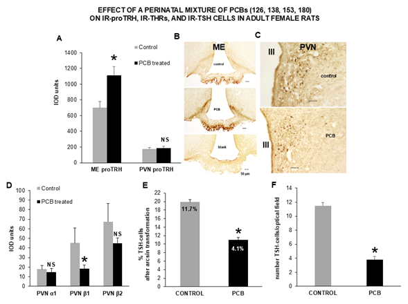 Figure 2. A) Compared to control rats, adult females from mothers treated with the PCB mixture during pregnancy and lactation showed a statistically significant increase in the IOD of IR-proTRH in axon terminals of the ME. In contrast, no changes in IOD occurred to IR-proTRH in neuronal cell bodies and dendrites of the pePVN and mpPVN. This was readily apparent at the LM level, where B) the external layer of the ME revealed a brown staining much more intense than that of controls (blank signifies absence of primary antibody against proTRH). This contrasted with C) neuronal cell bodies and fibers in the PVN, that stained at comparable visual intensity; D) a statistically significant decrease occurred to the IOD of IR-THR-β1 in nuclei of neurons of the pePVN and mpPVN. In contrast, in the same area no changes were revealed for IR-THRs-α1 and -β2; finally, a statistically significant decrease occurred to E) the percentage of IR-TSH cells and, F) number of IR-TSH cells in the anterior pituitary. Percentages are shown as arcsin-transformed values, whereas the original cell proportions are reported inside the bars, and their statistically significant difference established with a chi-squared 2x2 contingency table. Each graphic depicts the results of independent measurements on two different, control and PCB-treated rats. Each image was selected from an index animal, and from an average of three different optical fields. Data are expressed as the mean ± SEM; *: p<0.05; NS: not statistically significant with respect to controls; III: third ventricle; PVN: Paraventricular Nucleus; ME: Median Eminence.