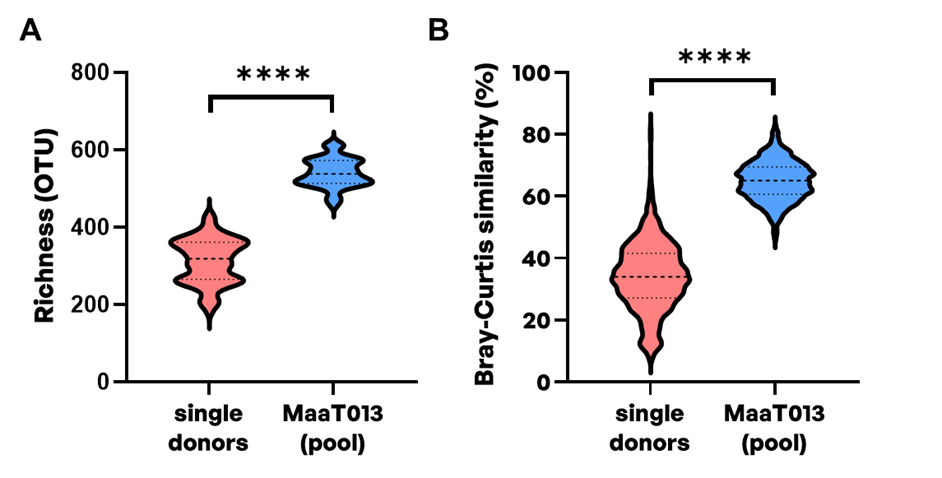 Figure 1. Microbial richness and Bray-Curtis similarity index in single-donor and corresponding MaaT013 (pooled) microbiotherapy products. 16S rDNA sequencing was performed to evaluate A) microbial richness at operational taxonomic unit (OTU) level and B) intra-groups Bray-Curtis similarities at OTU level for single-donors (n=78 fecal samples from 22 donors) and corresponding pooled MaaT013 batches (n=38). MaaT013 was manufactured through the pooling of feces from 4 to 8 strictly vetted healthy donors. The Bray-Curtis similarity index was calculated using one fecal sample per donor. Violin plots with median and range are presented. Statistical significances were evaluated using Wilcoxon test (**** p≤0.0001).