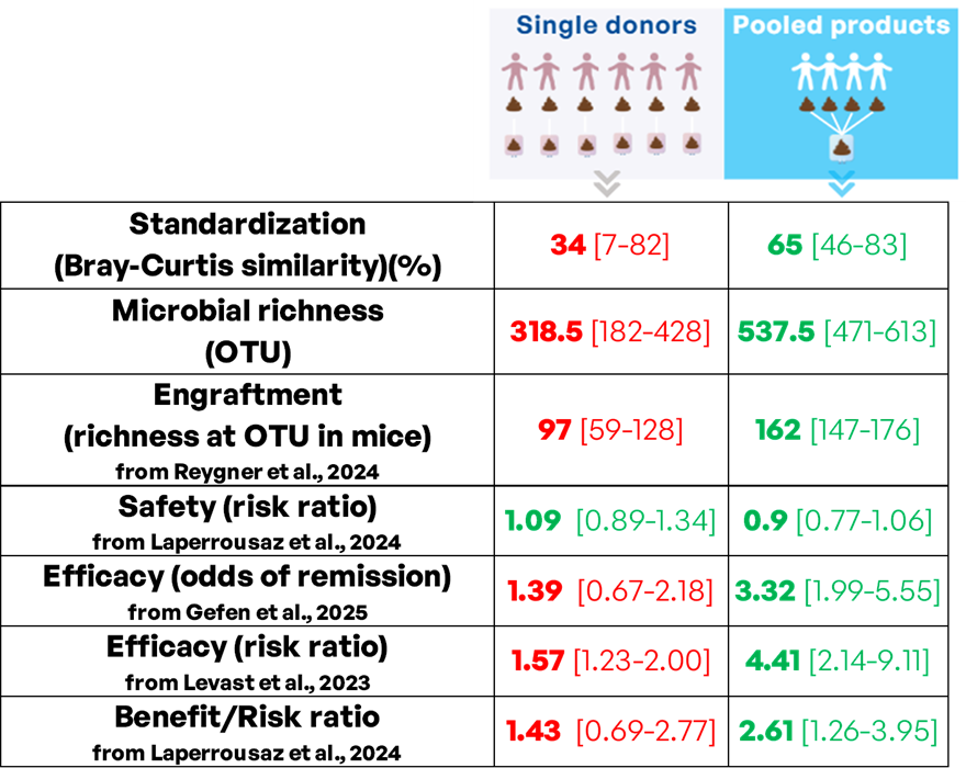 Figure 2. Comparison between single-donor and pooled products (FMT procedure or microbiotherapy). This figure synthesize evidence from metagenomic analysis, preclinical studies and meta-analyses of clinical trials in UC. Median and range are indicated.