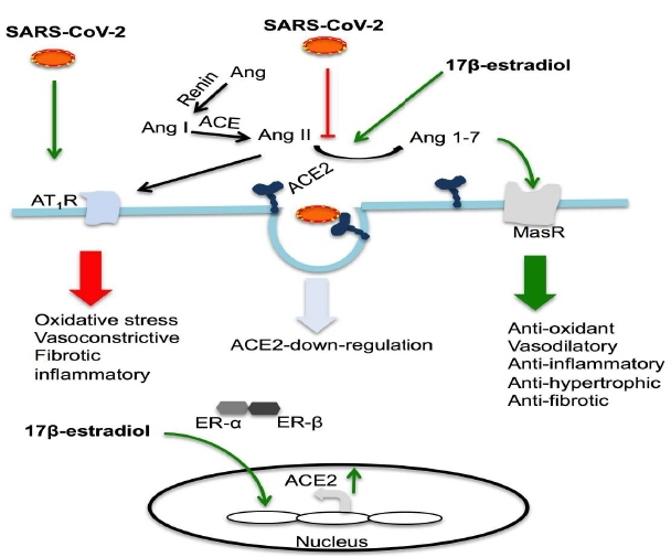 Figure 1: 17β-estradiol regulates the RAAS system by enhancing ACE2 expression. SARS-CoV-2 may activate the ACE/AT1 axis by down-regulating ACE2 and thereby promoting the development of ARDS by inducing an inflammatory storm and increasing oxidative stress. 17β-estradiol may enhance expression levels of ACE2 (ACE2/Mas axis) and reduce ARDS. Activation of estrogen receptors regulates 17β-estradiol-mediated cellular signaling and gene expression. ACE catalyzes the conversion of Ang I to Ang II, which activates AT1 receptors. ACE2 catalyzes the conversion of Ang II to Ang I-7, which activates the Mas receptor. (SARS-CoV-2, severe acute respiratory syndrome-coronavirus 2; ER-α, estrogen receptor-α; ER-β, estrogen receptor-β; AT1R, angiotensin II type 1 (AT1) receptor; ACE, angiotensin-converting enzyme; ACE2, angiotensin-converting enzyme 2; MasR, Mas receptor; Ang II, angiotensin II; Ang 1-7, angiotensin 1-7).