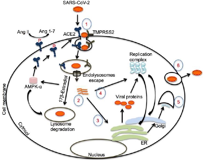Figure 3: Upregulation of endolysosomal degradation pathway by 17β-estradiol. The virus infects the cell by binding spike proteins with ACE2 on cell membranes following priming by TMPRSS2. Following endolysosome escape, RNA can accumulate in the cytosol, where it participates in protein translation. Translated proteins produce a replication complex to make viral RNA. 17β-estradiol may enhance the endolysosome’s degradation of the virus by enhancing the fusion of endosomes and lysosomes, probably by increasing AMPK activity and other possible mechanisms. Moreover, 17β-estradiol-mediated AMPK activation may enhance ACE2 stability by inducing phosphorylation and reduce ARDS and pulmonary hypertension. (SARS-CoV2: Severe Acute Respiratory Syndrome-Coronavirus 2; ACE2: Angiotensin-Converting Enzyme 2; p-ACE2: Phosphor-Angiotensin-Converting Enzyme 2; TMPRSS2: Transmembrane Protease, Serine 2; Ang II: Angiotensin II; Ang 1-7: Angiotensin 1-7; AMPKα: Adenosine Monophosphate Kinase-α; ER: Endoplasmic Reticulum).