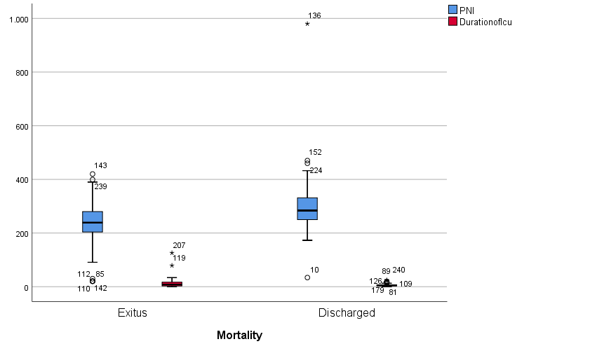 Figure 1. Box plot of PNI and duration of ICU according to mortality status. ICU: Intensive Care Unit; PNI: Prognostic Nutritional Index.