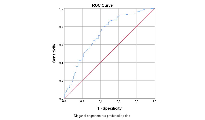 In the regression model (Nagelkerke R²=0.351, accuracy=74.8%), significant predictors of mortality included intensive care length of stay (OR=1.070), low albumin levels (OR=2.607), elevated urea (OR=1.014), and high lactate levels (OR=1.234) (all p<0.05) (Table 3).