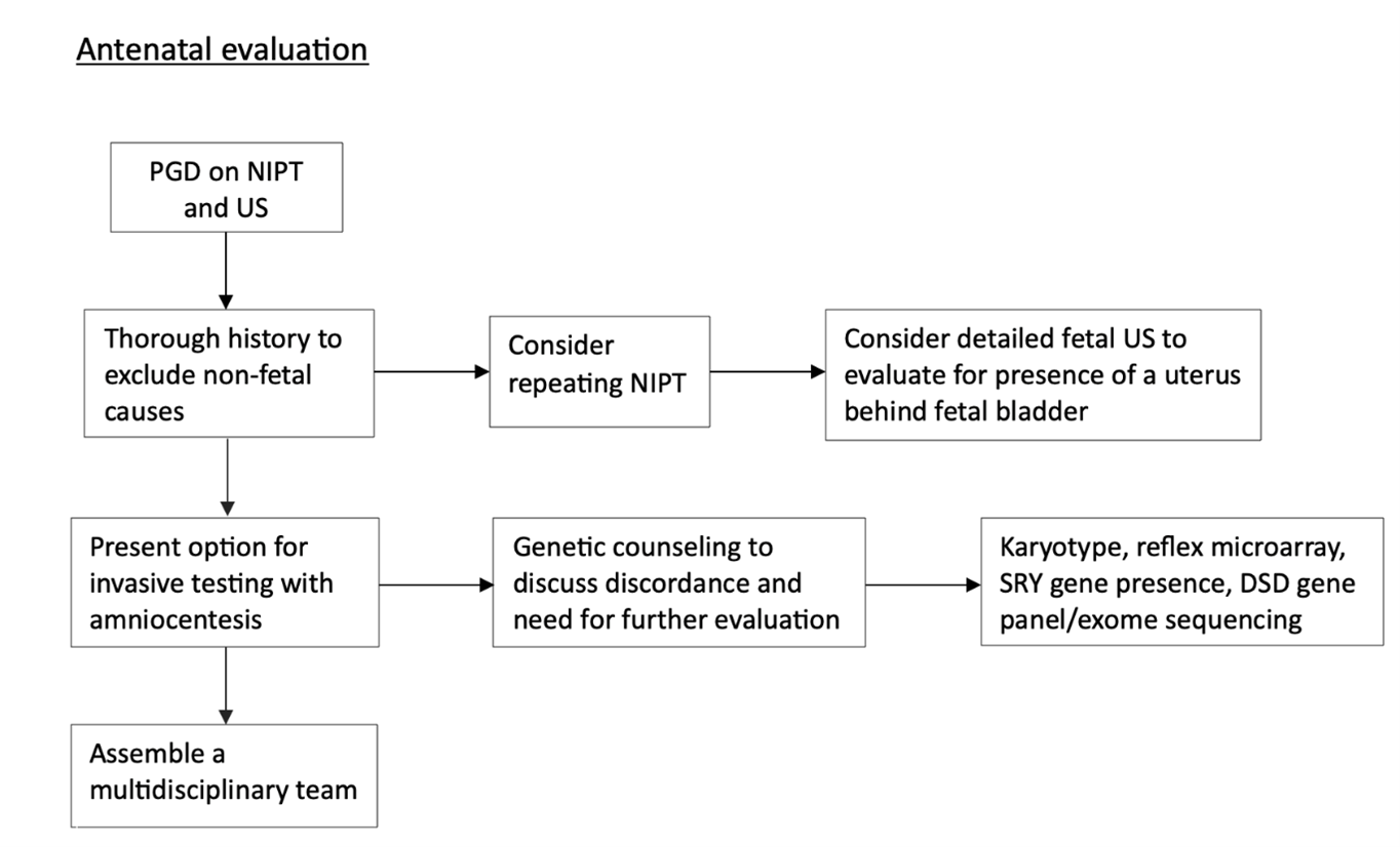 Discordance between genotype on NIPT and phenotype in the US can have many non-fetal causes, including human error (sample mislabeling, laboratory processing error, error in ultrasound assignment of sex) and biological (maternal transplanted organs from the opposite sex, co-twin demise, maternal neoplasm, placental chimeras or mosaics) [1]. A workup should begin with a thorough history to evaluate such non-fetal causes, and submission of a second sample for analysis may be recommended. If results exclude other potential causes, then investigation for a DSD should begin with genetic counseling and an offer of invasive testing such as amniocentesis for karyotype, reflex microarray, SRY gene, and DSD gene panel with possible exome sequencing to confirm the diagnosis [11].