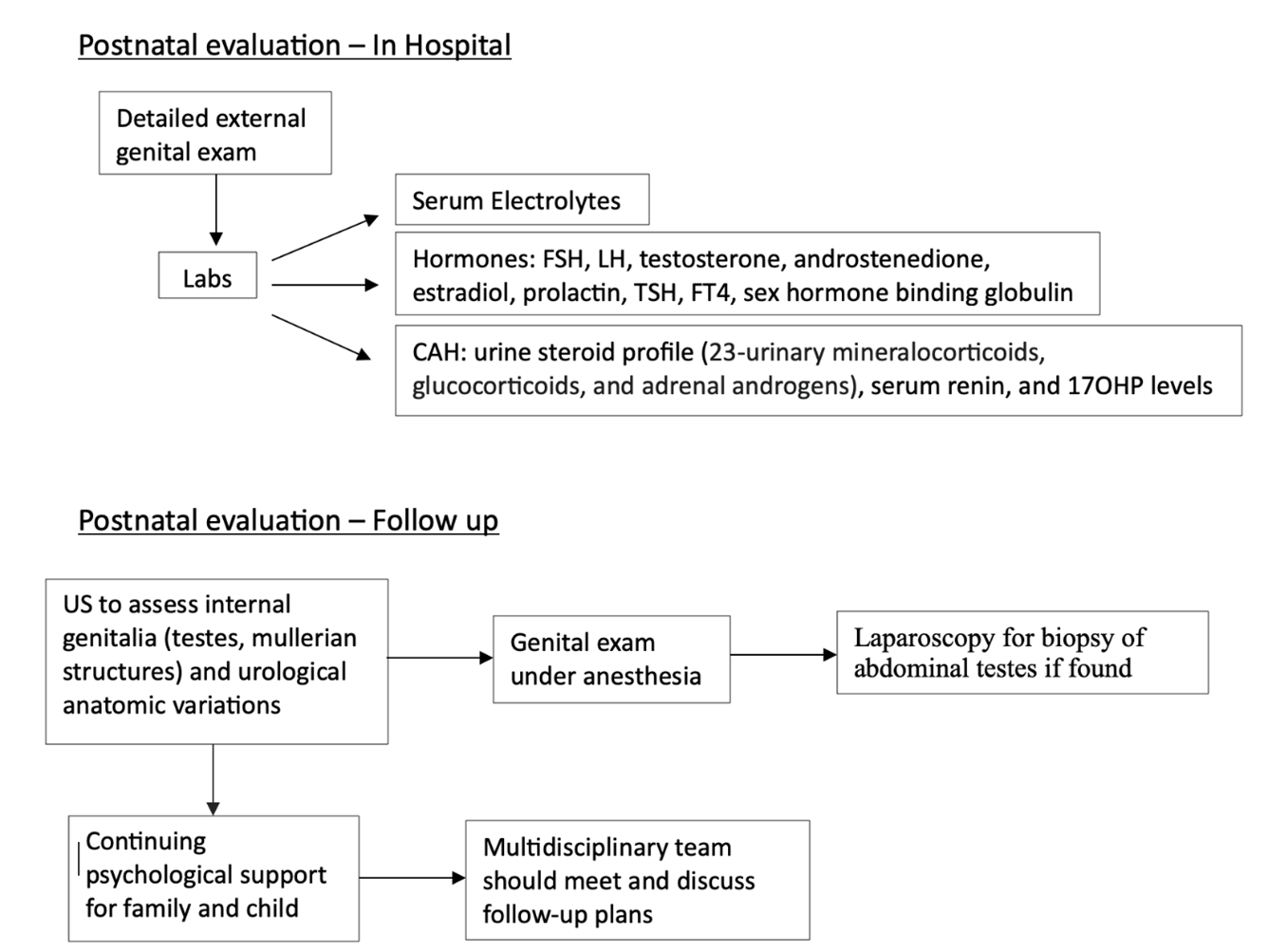 In addition to anatomic variations, patients with DSDs can have postnatal hormonal and electrolyte imbalances that can result in virilization, salt wasting, and significant morbidity and mortality, especially in the case of CAH [16]. Initial laboratory workup should consist of serum electrolytes, blood glucose, and hormonal assessment (FSH, LH, testosterone, androstenedione, estradiol, prolactin, FSH, FT4, sex hormone binding globulin, anti-mullerian hormone, and hCG) [17]. If serum electrolytes or routine newborn screening suggest a diagnosis of CAH, then further investigation determines 17-hydroxyprogesterone, DHT, deoxycorticosterone, DHEA, and plasma renin levels. The care team should perform a 24-hour urine steroid profile (23-urinary mineralocorticoids, glucocorticoids, and adrenal androgens), and they must prioritize these assays since complications from this condition can lead to significant, irreversible effects. [13,18-20].