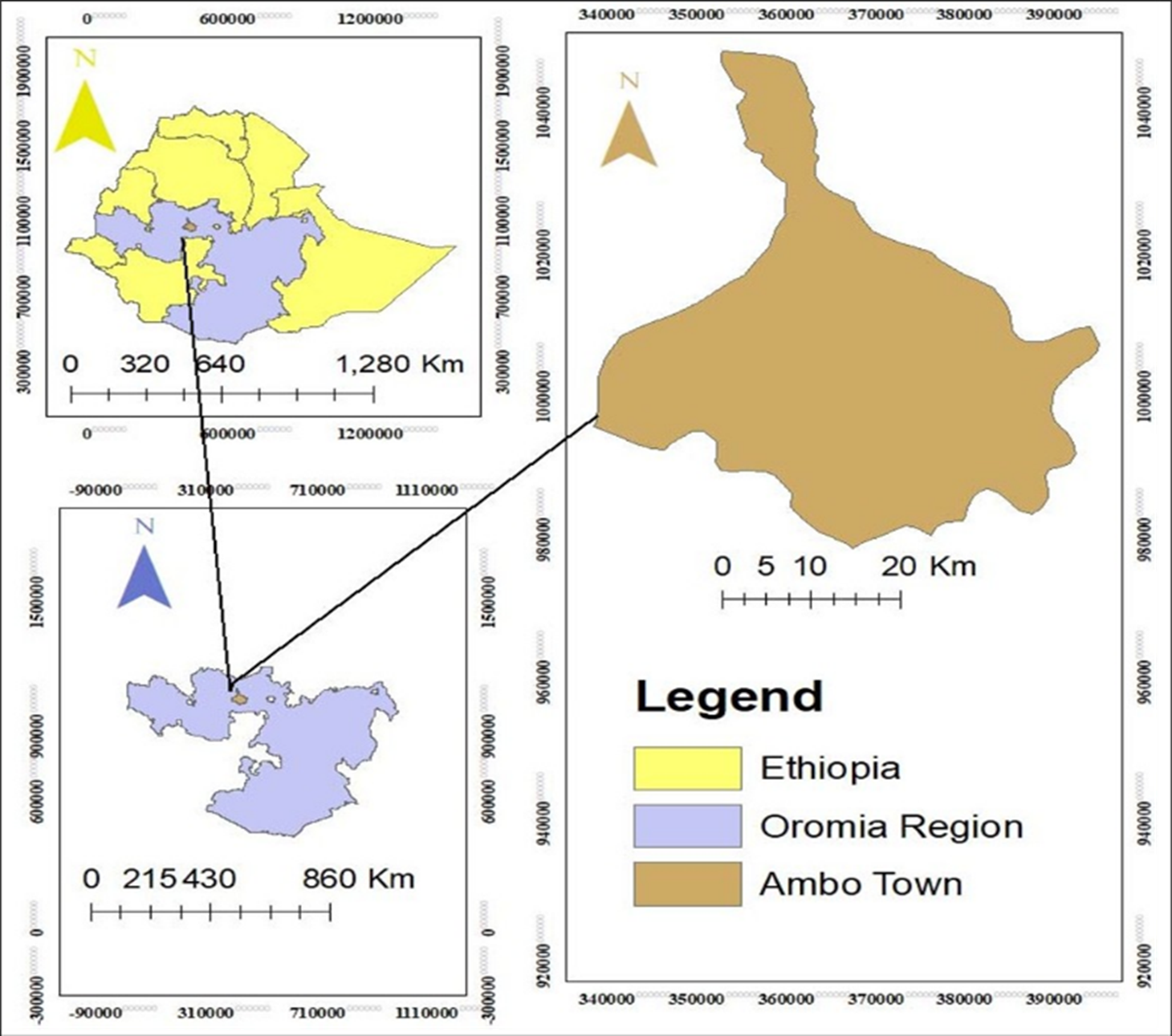 The study was conducted on selected poultry farms in and around Ambo, Ethiopia, from April to June 2019. Ambo, the administrative center of the West Shewa Zone, is situated at 8°59′N latitude and 37°51′E longitude, at an altitude of 2,101 meters above sea level and approximately 114 km west of Addis Ababa (Figure 1). Ambo Woreda comprises 34 administrative kebeles. The agro-ecology of the area is characterized by 23% highland, 60% midland, and 17% lowland zones. The region experiences an annual rainfall of 800–1,000 mm and a temperature range of 20–29°C. The livestock population includes approximately 145,371 cattle, 50,152 sheep, 27,026 goats, 105,794 chicken, 9,088 horses, 2,914 donkeys, and 256 mules [14].