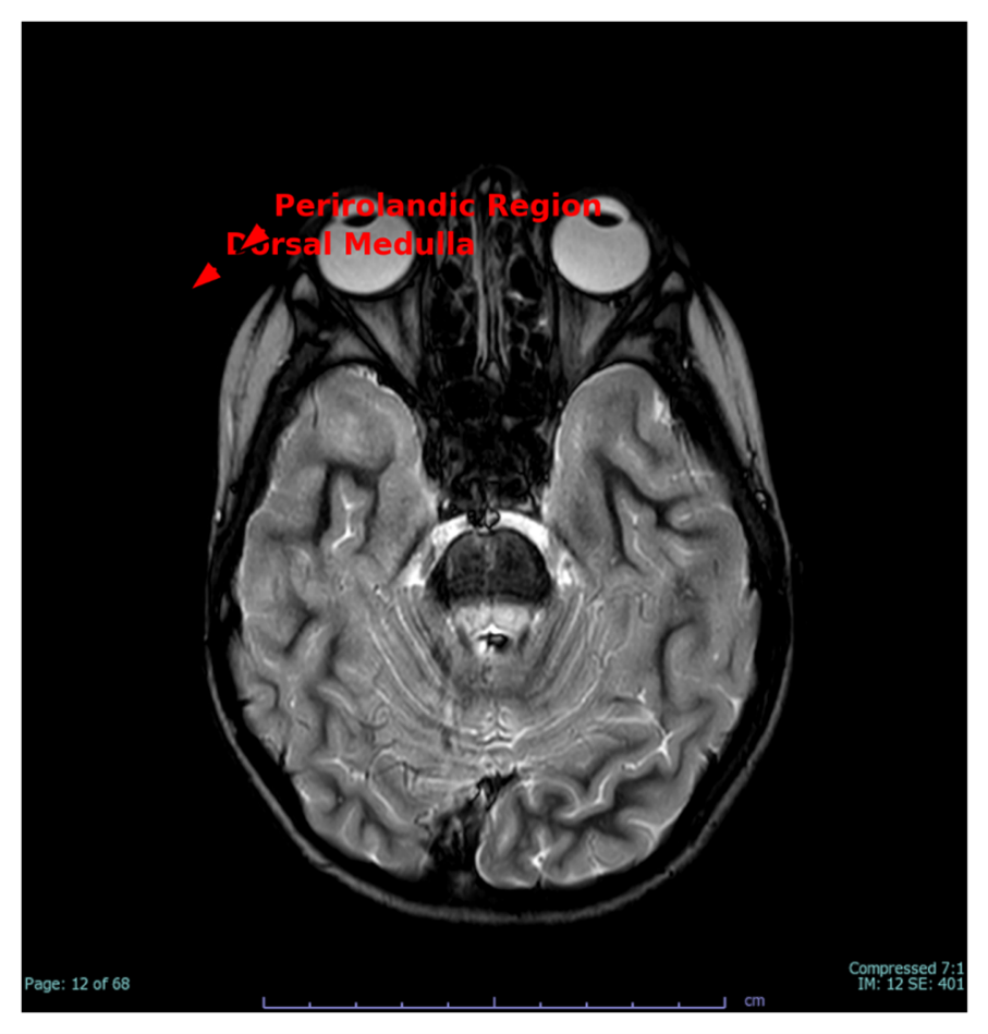 Figure 3 demonstrates dorsal medulla signal alterations and volume loss in the perirolandic area, perhaps indicating a mixture of progressive mitochondrial degeneration and a distant perinatal hypoxic injury. These abnormalities correlate with the patient's dysautonomia, fine motor weakness, and evidence of pyramidal tract dysfunction.