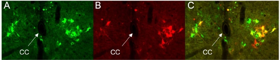 Figure 2: Trans-synaptically traced interneurons in the upper L4 of a P35 male rat. Concomitant injections of PRV-GFP in the EUS (A) and PRV-RFP in the bladder wall (B) resulted in three main types of labeling: purely green neurons included only in the EUS circuit, purely red cells included only in the bladder circuit and cells expressing green and red fluorescent proteins (yellow color in C=A+B) for cells involved in both circuits.