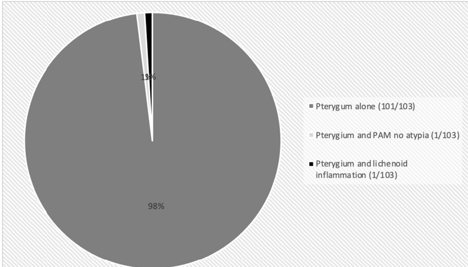 Samples were not sent for histology in 31 of 134 cases (23%). Of the 103 cases sent for histology; 98% (101/103) gave a histological diagnosis of pterygium alone, 2% (2/103) gave a histological diagnosis of pterygium with a further diagnosis (lichenoid inflammation (1/103), primary acquired melanosis (PAM) without atypia (1/103). The exact histological summary of the case which showed lichenoid inflammation was “focal lichenoid inflammation, the significance of which is unclear. There is no evidence of conjunctival intraepithelial neoplasia”. The exact histological summary of the case showing primary acquired melanosis without atypia was “The features are in keeping with pterygium. In addition, basal pigmentation may represent primary acquired melanosis without atypia”.