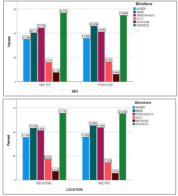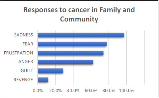 Of the 1011 participants, 998 responded to the question about how they felt about cancer in the family/community. Of the 988 participants more than half (66.6%) were females, and almost half (49.5%) were below the age of 37 years. Almost two-thirds (62.6%) resided in non-metropolitan locations and 67.5% reported high school as the highest educational attainment. More than half reported to feeling Anger (58.2%) and 69% reported feelings of frustration. Most (90.8%) reported feeling sad, 26.6% felt guilt whilst 10.8% reported feelings of revenge on hearing of cancer in the family or community. Almost three-quarters (72.1%) reported feeling fear on hearing the diagnosis (Figures 1 and 2, Table 2).