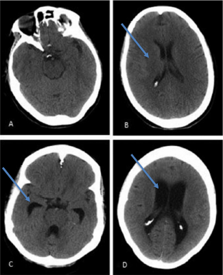 Figure 1: A and B: CT Scan of 71-year old female presenting with normal cognitive function with normal ventricular size whereas C and D are a CT scan of that of a 68-year old female with NPH with visible enlarged ventricles [14].