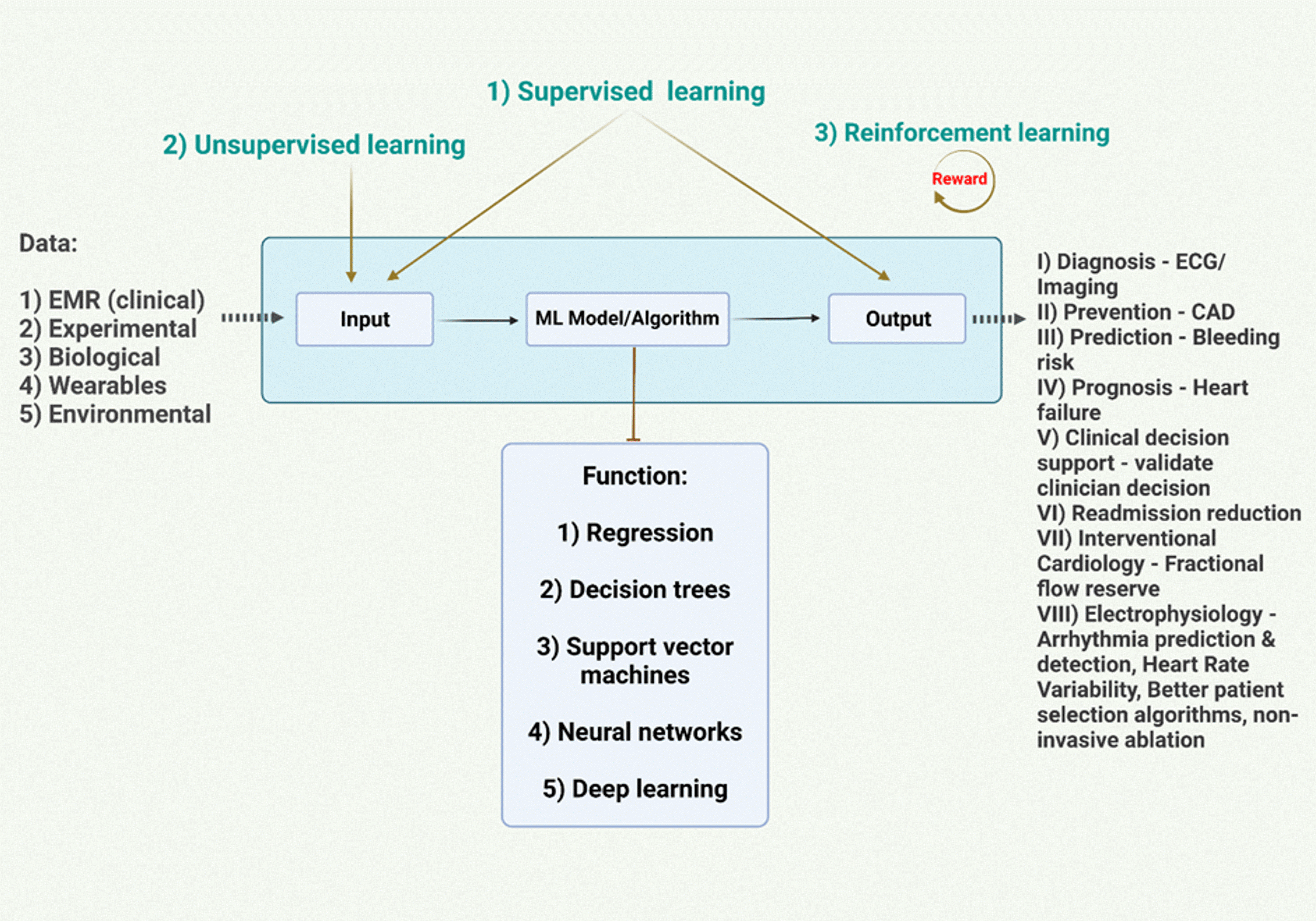 Research in the field of cardiovascular medicine continues to advance, with ongoing efforts to identify novel biomarkers, develop targeted therapies, and improve healthcare delivery [6]. The integration of multidisciplinary approaches, including genetics, genomics, and data science, holds promise for improving our understanding of the pathophysiology of CVDs and developing more effective prevention and treatment strategies [7]. Ultimately, the goal is to reduce the global burden of CVDs and improve the quality of life for those affected by these diseases. Artificial intelligence (AI) has the potential to revolutionize the field of cardiovascular medicine by improving the accuracy of diagnosis, predicting disease progression, and individualizing treatment plans. AI encompasses a range of techniques, including machine learning, deep learning, and natural language processing, which can be used to analyze large datasets and extract meaningful insights [8]. One area where AI has shown promise in cardiovascular medicine is in the analysis of medical images [9]. AI algorithms can be trained to accurately identify and classify abnormalities in images such as CT scans, MRI, and echocardiography, allowing for earlier and more accurate diagnosis of cardiovascular diseases [10-12]. AI can also be used to analyze other types of data, such as electrocardiograms (ECGs) and genetic data, to predict the risk of developing CVDs and guide treatment decisions. In addition to improving diagnosis and risk prediction, AI can also be used to develop personalized treatment plans for patients with CVDs [13]. By analyzing patient data, including medical history, imaging, and genetic data, AI algorithms can identify the most effective treatment options for individual patients, taking into account their unique characteristics and needs [14].