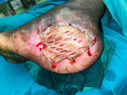 The raw area successfully integrated the CAMP, and the wound granulated effectively. After two weeks, the wound was grafted with autologous FTSG.