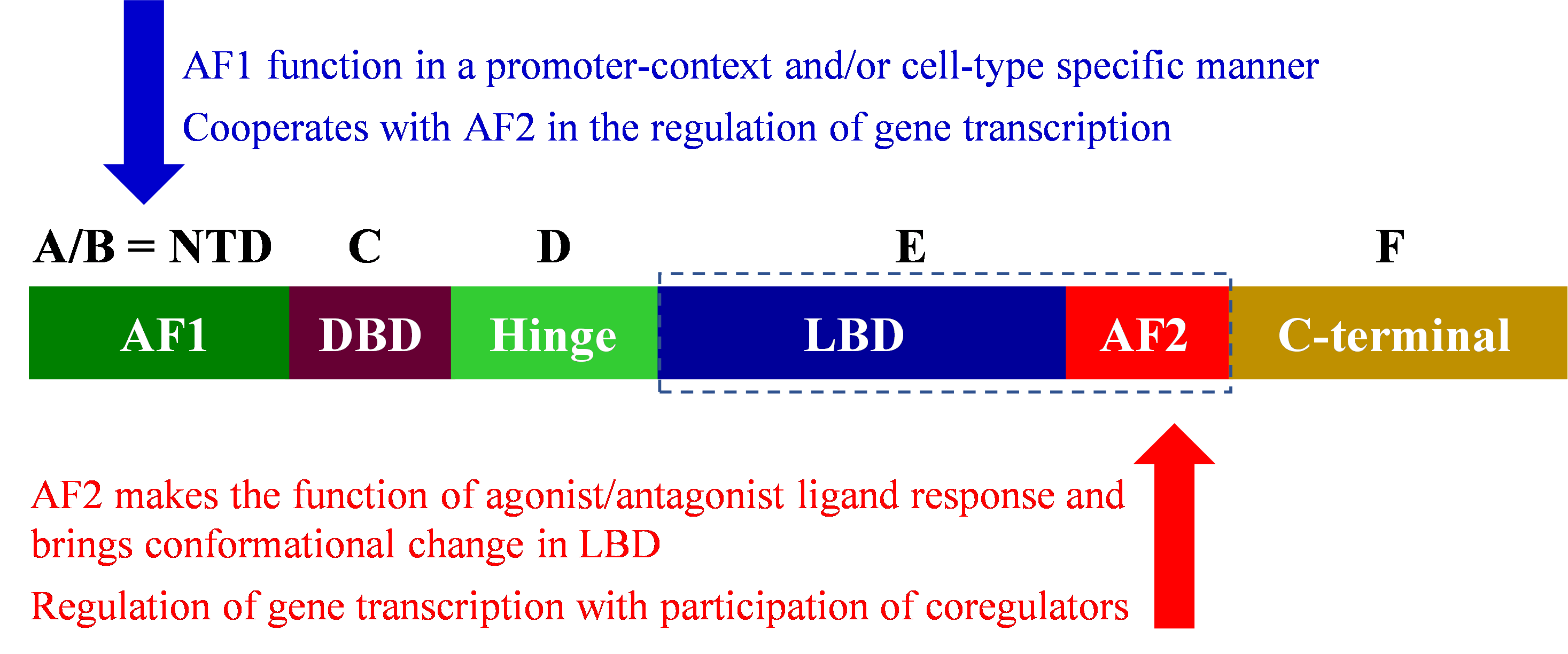 Except for small heterodimer partner (SHP) and dosage-sensitive sex reversal-adrenal hypoplasia congenita critical region on the X chromosome, gene (DAX) (orphan members of the NR), NR possesses six domains from A-F, in some NRs, F domain may be absent. The NH2-terminal domain varies in length and seems highly disorganized when the detailed structure of all 48 receptors of mammalian NRs is examined. The NH2-terminal domain contains activator function-1 (AF-1) which can interact with coregulators in a promoter-specific manner [56]. Variations in NH2-terminal produce isoforms through alternative splicing such as multiple forms of the glucocorticoid receptor (GR), GRB, and GRA [57] and thyroid receptor (TR) [58] while variation in the carboxylic end also produces isoforms such as multiple forms of estrogen receptor-β (ERβ) [59]. Modular structure of selective NRs is presented in Figure 3.