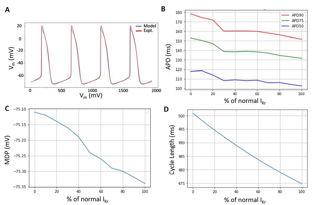 Figure 3: Computer model outcome. A) AP morphology and spontaneous triggering of APs in computer model (blue) compared to experimental data (red). B) AP prolongation at various levels of IKr blockade. C) Depolarization of MDP and D) increase in cycle length (CL) of spontaneous APs for varying levels of IKr block.
