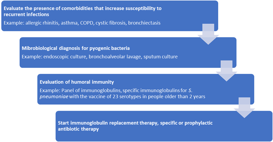 The treatment of this pathology is based on preventing recurrent infections by known microorganisms, and in the case of serious infections, the use of intravenous or subcutaneous immunoglobulin. Next, we will review the therapeutic options that have been used throughout the years, although there is a lack of scientific evidence for a standardized treatment.