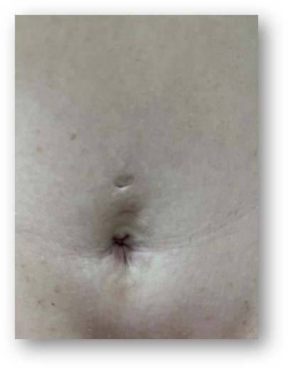 The initial attending physician in the emergency department performed a standard emergency and internal medical examination, which revealed no abnormalities of the neck and chest, and the neurological status was unremarkable as well. Two findings were noteworthy on the physical examination: a tender, well-palpable intra-abdominal mass in the periumbilical region—approximately the size of a clenched fist, and a small -roughly 1 cm in diameter- erythematosus nodule within the umbilical fossa (Figure 1). A palpable abdominal mass by itself does not indicate malignant diseases; additional imaging and specialist evaluation are required to establish a definitive diagnosis [11]. In light of the subsequent diagnosis, the erythematous cutaneous lesion is a Sister Mary Joseph nodule, which occurs in abdominopelvic adenocarcinomas in approximately 1–3% of cases and predicts a very poor prognosis, with an average survival of 11 months [12]. The nodule can be interpreted as a paraneoplastic manifestation—namely, a cutaneous metastasis of gastrointestinal malignancies—which may often be among the earliest signs of an underlying abdominal cancer [13].
