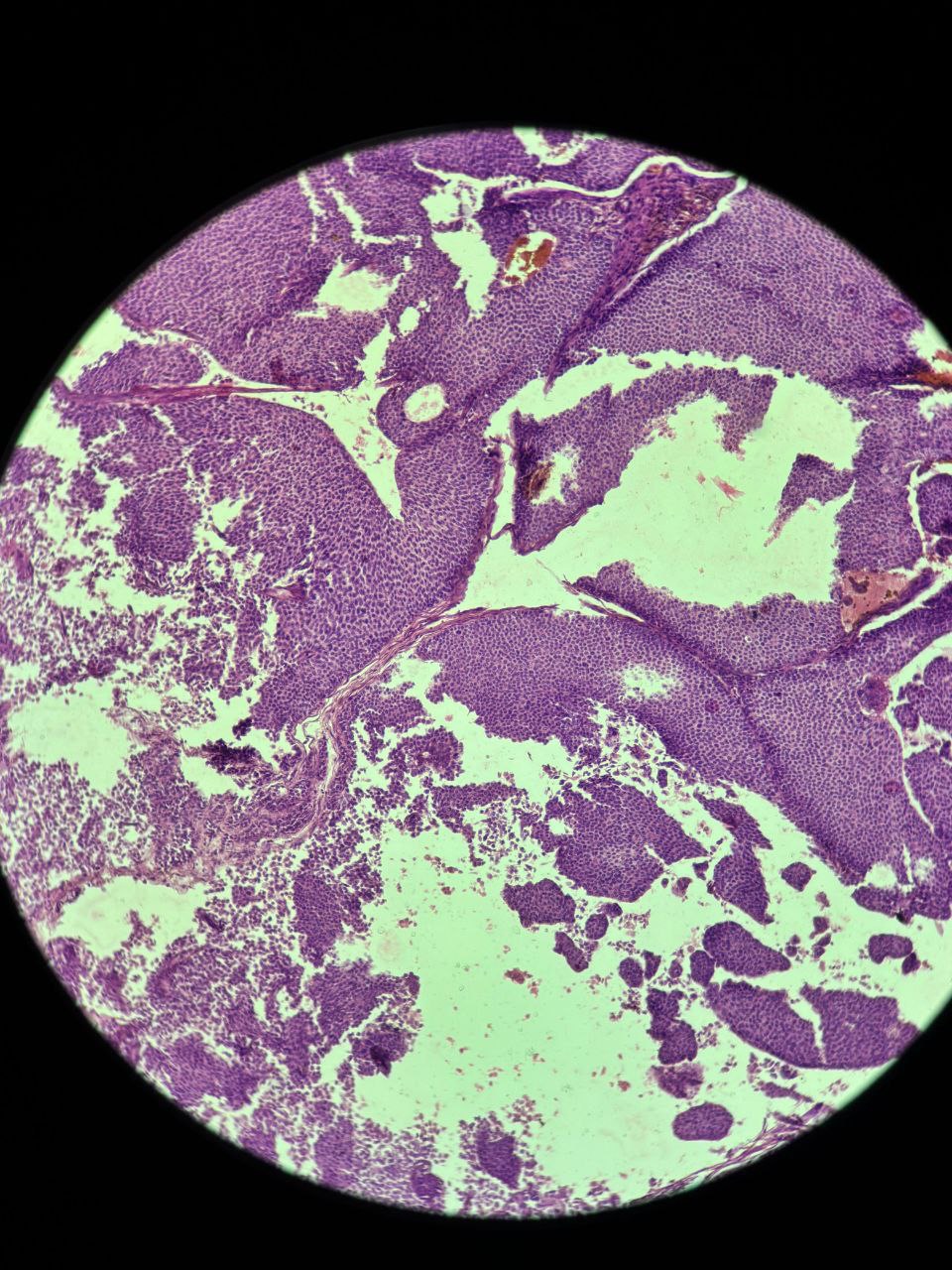 Figure 1. Microscopic histopathological appearance showing expansile nodules composed of a solid epithelial proliferation, punctuated by delicate fibrovascular cores.