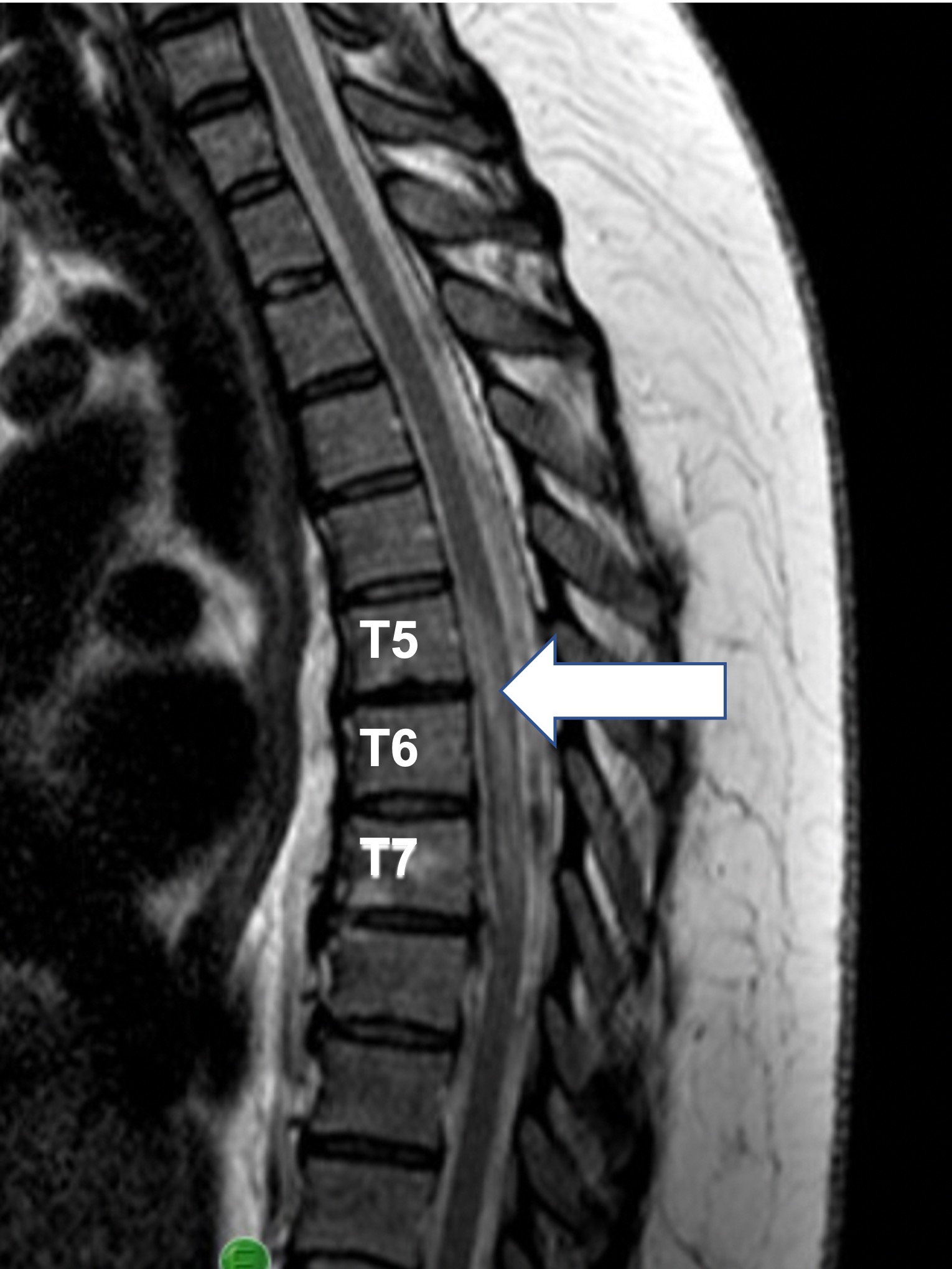 Figure 1. An acute T2 intramedullary signal hyperintensity is seen T5-T7, consistent with spinal cord infarct vs demyelinating disease. Clinical presentation and laboratory findings strongly suggested a diagnosis of infarct over demyelinating disease.