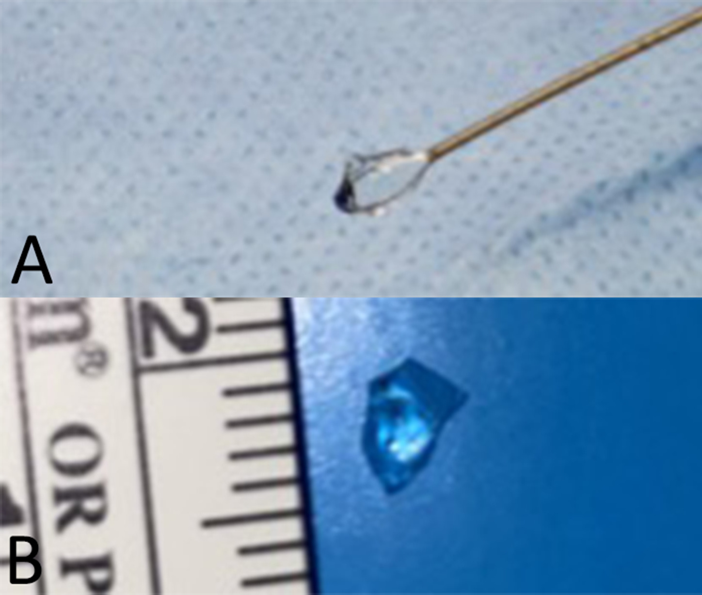 Figure 2. A. Tipless nitinol stone basket enclosing the extracted glass intraocular foreign body from the vitreous cavity, B. glass foreign body, measured 5 mm ´ 4 mm ´ 3.5 mm in size.