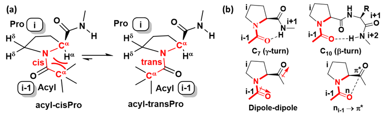 Figure 1. (a) cis/trans isomerism at prolyl amide bond showing Cαi-1)(Cαi steric repulsion in cisPro; (b) Local intramolecular non-covalent interactions stabilizing transPro.