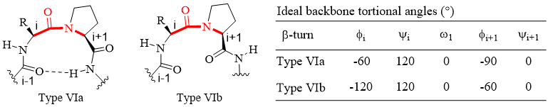 Type VI β-turns are the only ordered structures where the Xaa-cisPro motif is observed with any regularity [5]. These structures, where a cis amide bond exists between the i and i+1 (Pro) residues of the turn, are classified into two sub-types (VIa, VIb) based on the dihedral angle values of their central i and i+1 (Pro) residues (Figure 3) [28].