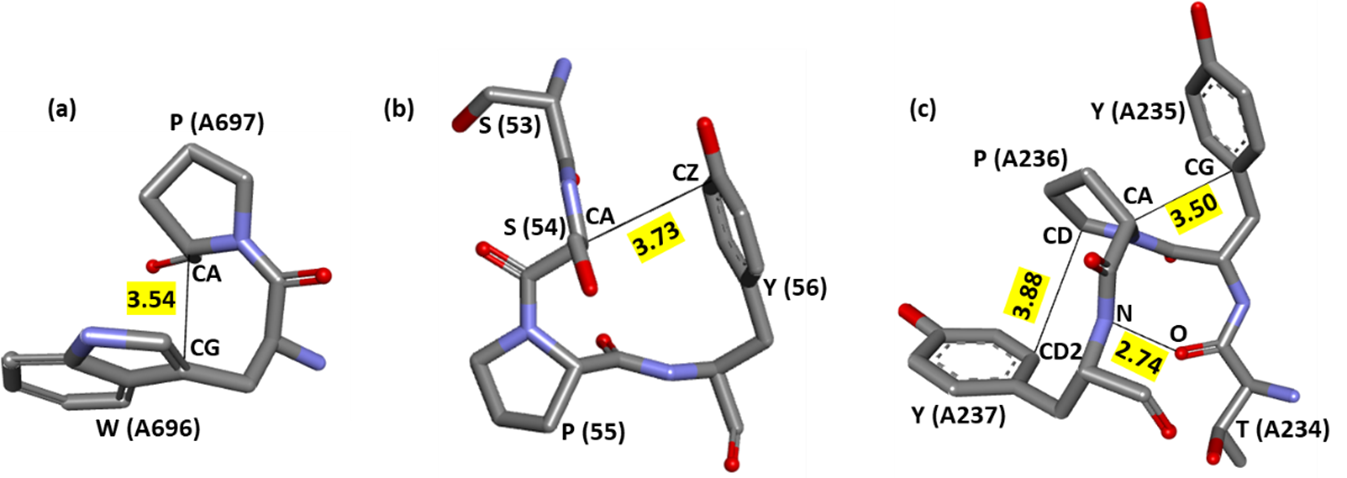 In a statistical analysis of protein crystal structures in the Brookhaven Protein Data Bank, aromatic–prolyl (Aro-Pro) interactions have been observed to stabilize type VI β-turns and hence increase the frequency of occurrence of the cisPro isomer (Figure 4) [6]. In most of these type VI β-turns, the CαPro×××CgAro distance is ≤ 3.7 Å. Based on this, it has been proposed that the specific orientation of HαPro proton towards the Aro side chain seems to enable an apparent CαPro–HαPro···pAro (C-H···p) interaction. In Pro-Aro sequences as well, the HαPro protons are close (≤ 4.4 Å) to the Aro ring, implicating the existence of the CH···π interactions. These cis-stabilising local interactions have been suggested to be the reason for the increased frequency of occurrence of the cisPro isomer in Aro-Pro and Pro-Aro sequences.