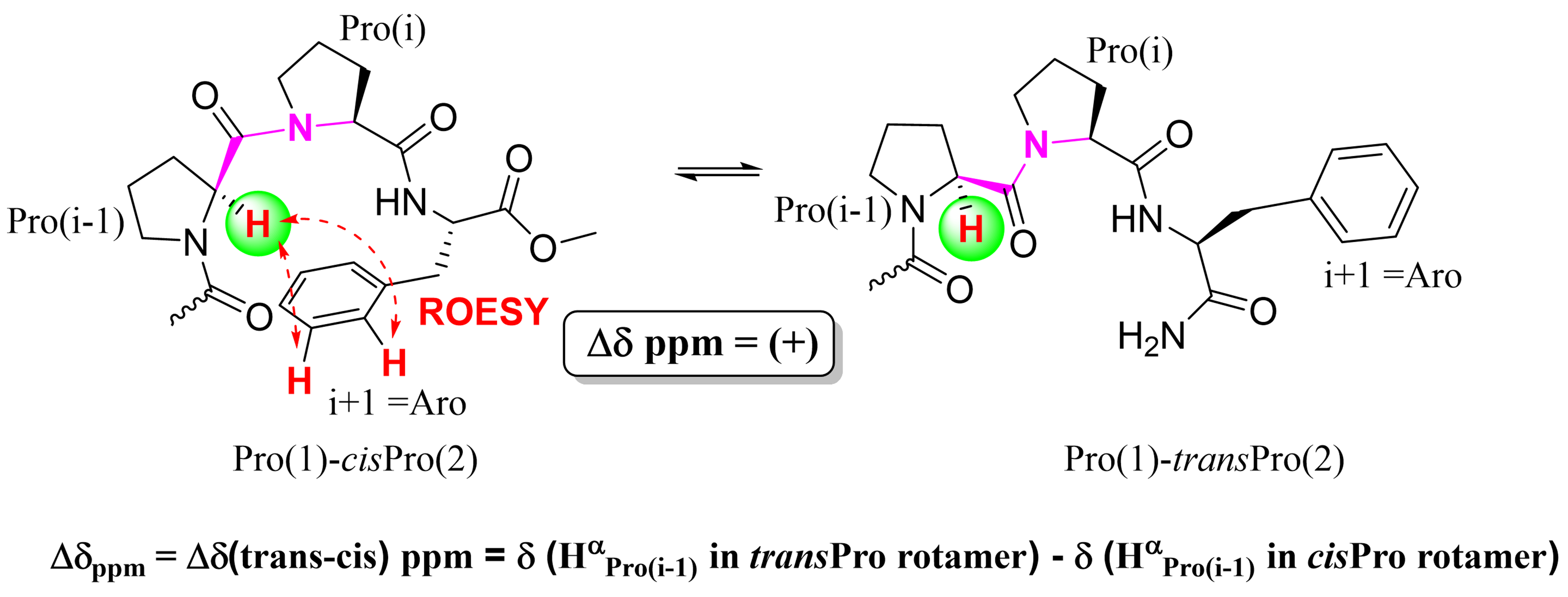 NMR analyses of the cis/trans isomerism at Pro-Pro peptide bond in Proi-1-Proi-Xaai+1 sequence containing short peptides in solution revealed [29] that when Xaai+1 is an aromatic residue, (i) the Hα of the N-terminal Proi-1 (HαPro(i-1)) is upfield shifted and (ii) NOE cross peaks are observed between HαPro(i-1) and the aromatic ring of the Aro side chain (Figure 5). These are indicators of local (i-1…i+1) Cαi-1-Hαi-1···πi+1 interactions formed in these models. These interactions stabilize the cis conformation of the Proi-1-Proi amide bond and increases the cisPro population by upto 4.9 times when Xaai+1 is aromatic compared to when it is aliphatic. In Aro-Pro sequences as well, such cisPro stabilization has been observed [30].