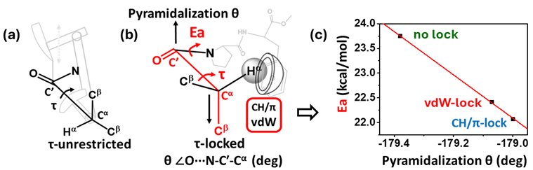 Figure 8. Model in which rotation along Cα-C′ bond (τ) is (a) unrestricted, (b) locked by a CH···π or vdW interaction; (c) Corresponding drop in activation energy barrier of prolyl amide cis/trans isomerism. (Reproduced from [33]).