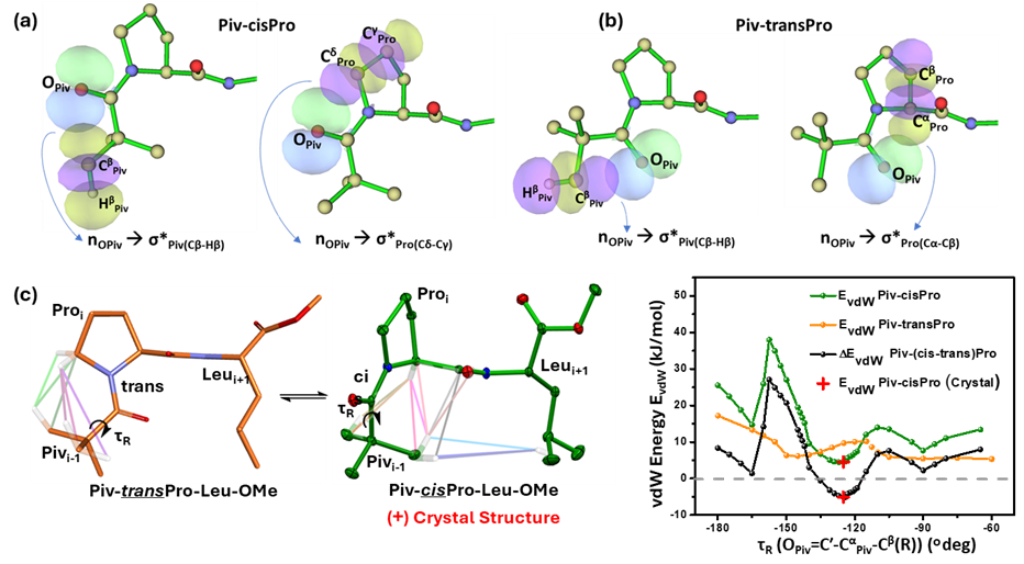 Figure 12. NBO renditions of: (a) the nOPiv à σ*Piv(Cβ-Hβ) and nOPiv à σ*Pro(Cδ-Cγ) orbital overlap interactions at Piv-cisPro conformer and (b) the nOPiv à σ*Piv(Cβ-Hβ) and nOPiv à σ*Pro(Cα-Cβ) orbital overlap interactions at Piv-transPro conformer. (c) Network of vdW interactions in cisPro and transPro and plots of net vdW interactions. (Reproduced from [37]).